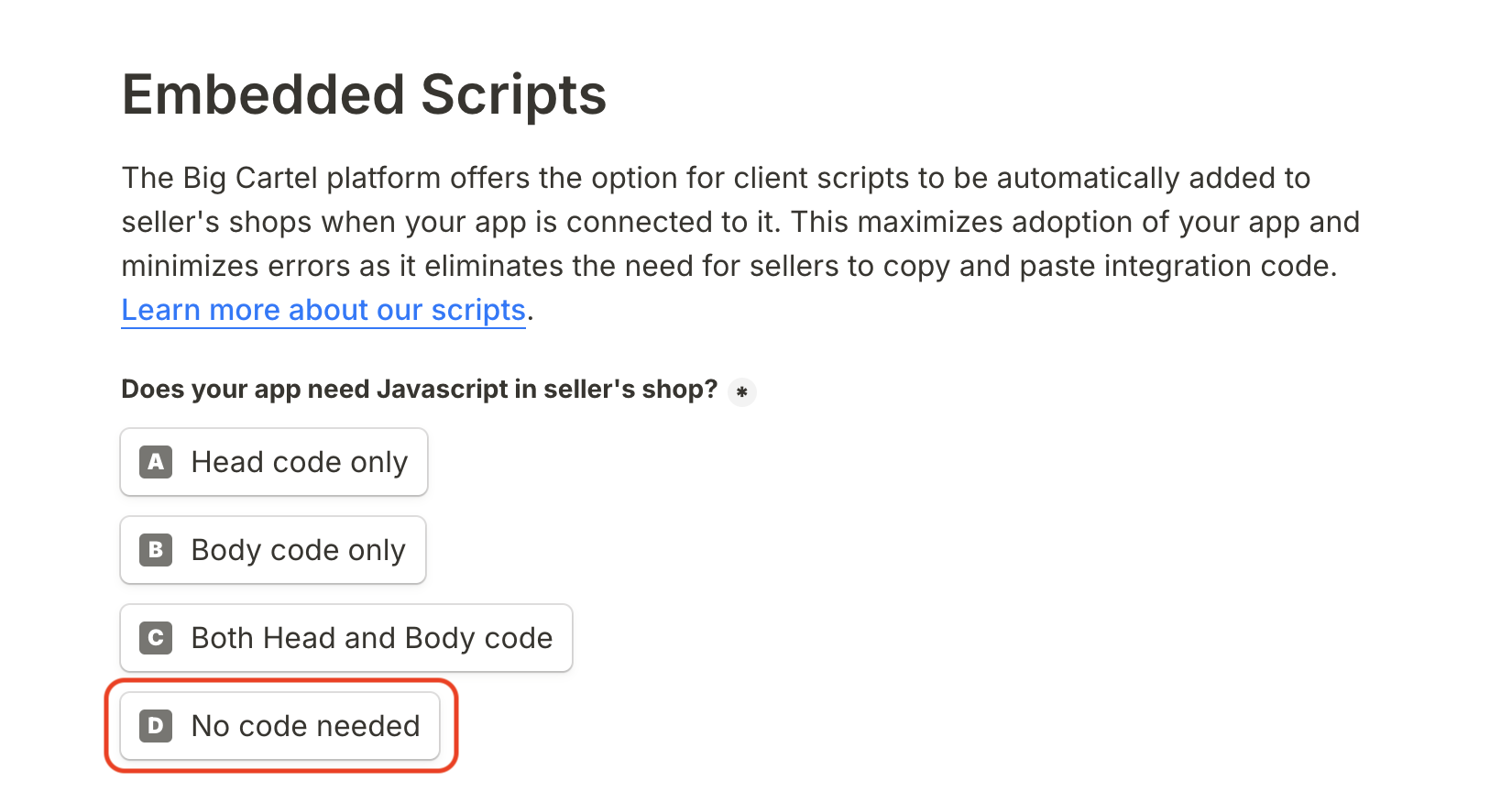 When asked, "Does your app need Javascript in seller's shop?" Select "No Code Needed."